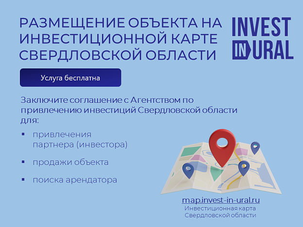 Министерством инвестиций и развития Свердловской области совместно с Министерством цифрового развития и связи Свердловской области спроектирован сервис, позволяющий размещать объекты, находящиеся в частной собственности, на инвестиционной карте Свердловской области (map.invest-in-ural.ru/).Для этого правообладатель объекта направляет в АНО «Агентство по привлечению инвестиций Свердловской области» заявку о размещении объекта посредством личного кабинета инвестора: https://lk.invest-inural.ru/invest/catalog/services/71402
